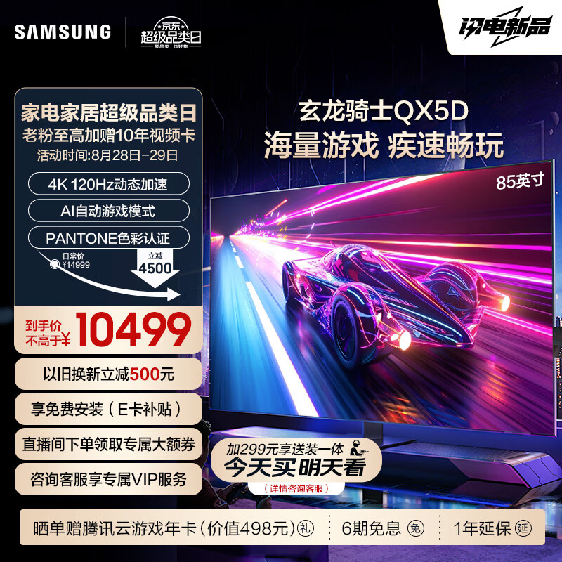 三星(SAMSUNG)85QX5D 85英寸 QLED量子点 玄龙骑士 专业游戏AI电视 彩通色彩 无开机广告 QA85QX5DAJXXZ价格:10499.00元!