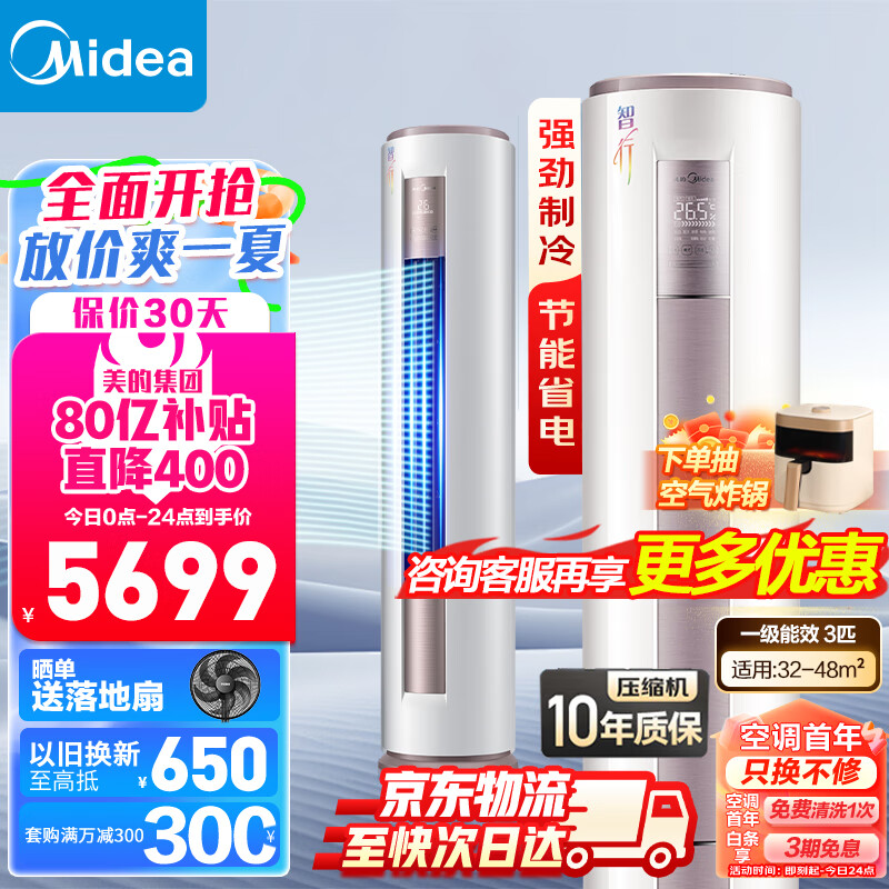 美的(Midea)智行三代自清洁一级能效3匹空调变频冷暖两用制冷制热柜机立式客厅大出风口空调家电以旧换新YH200价格:5499.00元!