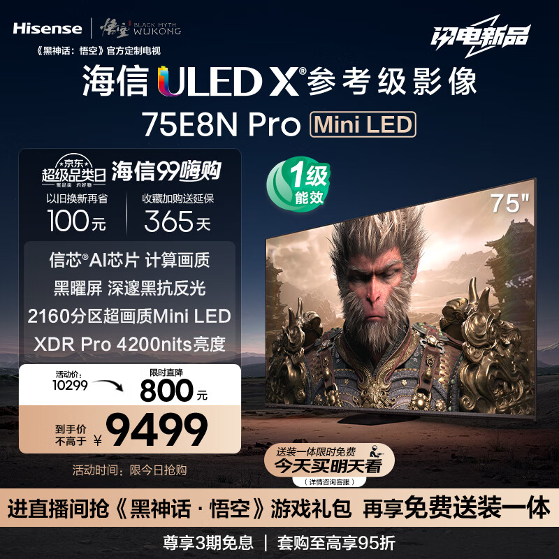 海信电视75E8N Pro 75英寸黑神话悟空游戏 ULED超画质2160分区Mini LED超薄大屏 北京以旧换新一级能效价格:9499.00元!