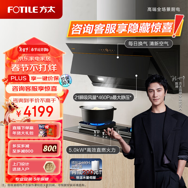 方太(FOTILE)抽吸油烟机灶具套装侧吸式烟灶套装智能挥手21大风量智能挥手5.0kW猛火双灶家用 JCD7+TH26B天然气价格:4199.00元!