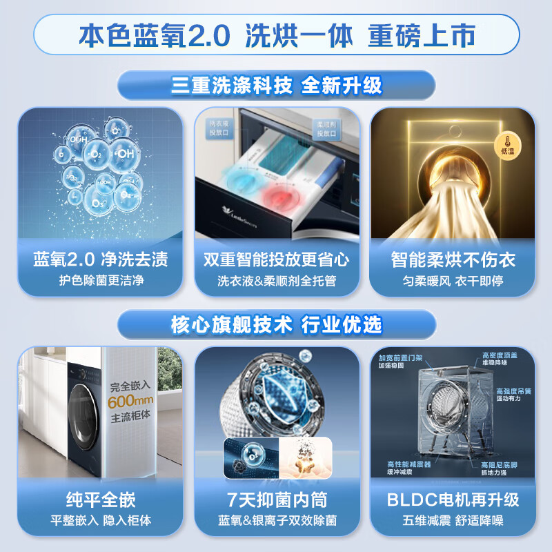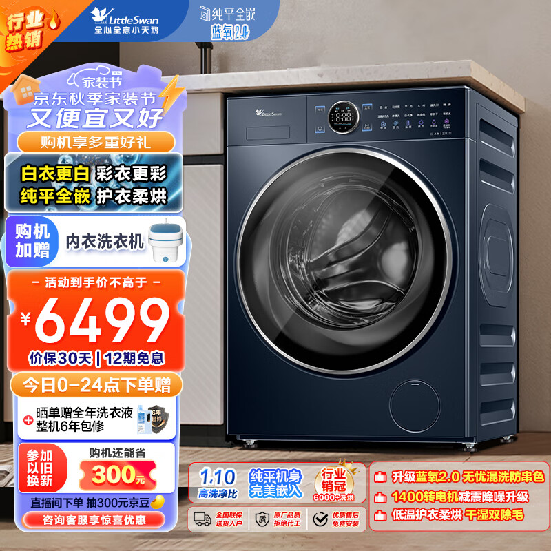 小天鹅(LittleSwan)滚筒洗衣机全自动家用 带烘干洗烘一体 纯平全嵌【小蓝鲸2.0 TD100V89PRO】蓝氧 以旧换新 10公斤价格:6499.00元!