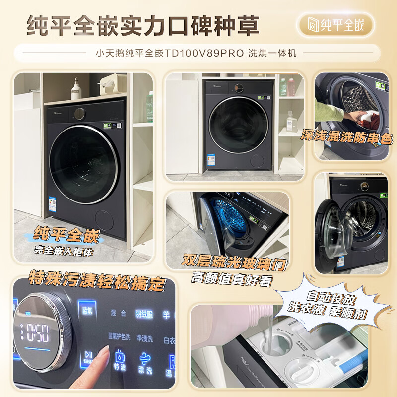 给大家分享下!实实在在的说这款小天鹅TD100V89PRO,总体感觉还满意的,小乌梅洗衣机洗的声音真的满意!算是比较小的,又比波轮洗衣机省很多水!又省洗衣液,洗的也千净。又不会缭乱一卷,可以连接wifi手机可以控制,买来才知道有这个功能。10公斤可以洗很多,电机力气很大。脱水是上排水明显比重力自流好。。。总之很满意这台洗衣机!送装同步好评!