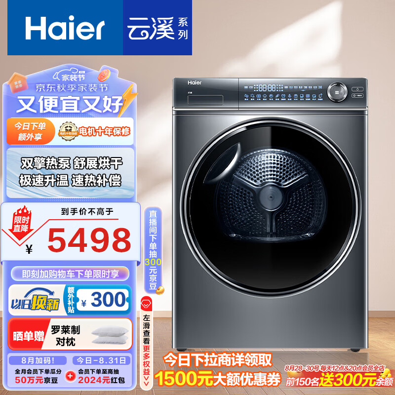 海尔(Haier)云溪376 10KG变频双擎热泵式烘干机家用烘衣机干衣机 养护空气洗 HGY100-F376U1 以旧换新价格:6999.00元!