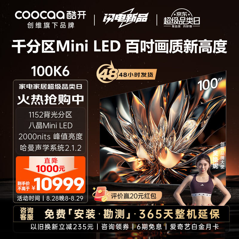 酷开创维100K6 100英寸 Mini LED 2000nits 1152分区 4K 144Hz 哈曼调音一级能效液晶游戏电视机100P6E价格:10999.00元!