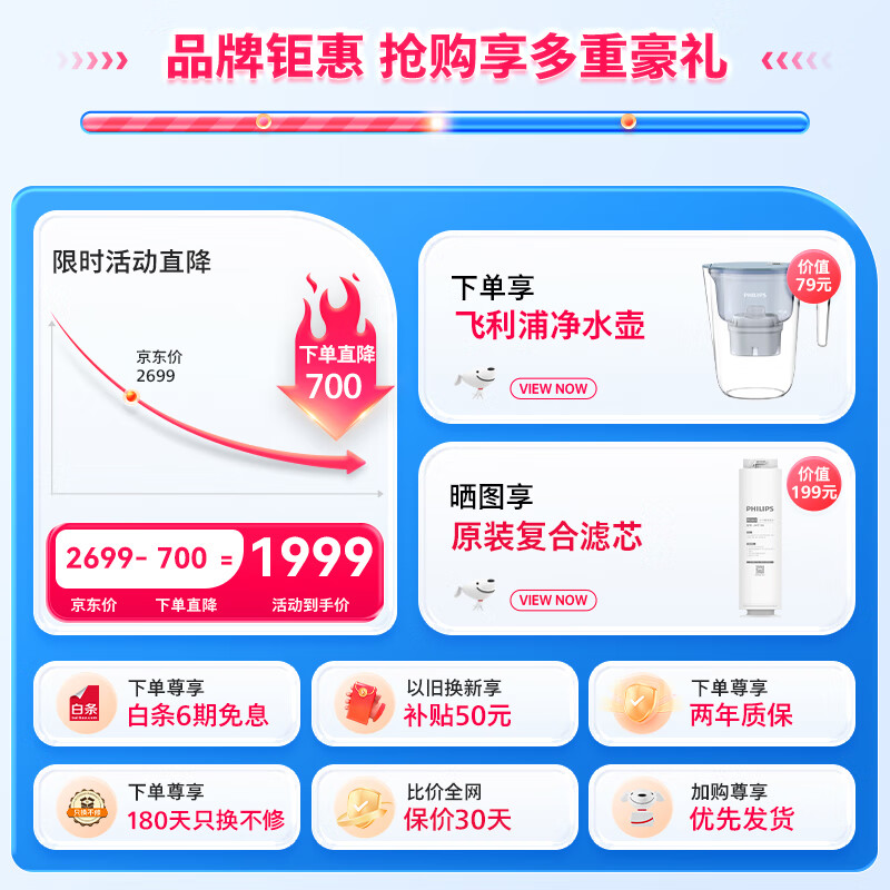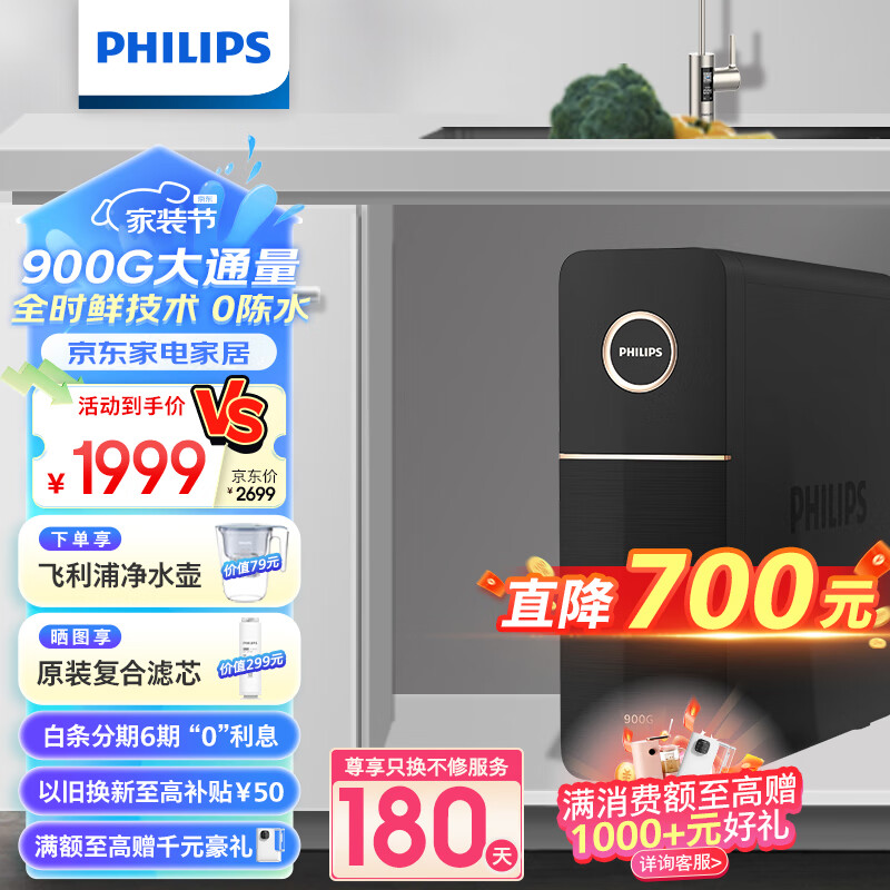 飞利浦(PHILIPS)净水器家用净水机引擎Pro900G 5年RO反渗透 全时鲜 零陈水2.3L/分大流速 厨下式净水器 AUT7012价格:1999.00元!