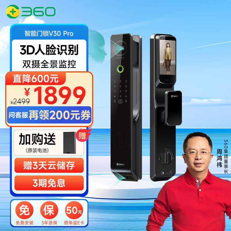 360智能门锁V30pro 3D人脸识别智能锁 双摄像头全景监控 家用入户指纹锁电子锁密码锁防盗可视猫眼价格:1899.00元!
