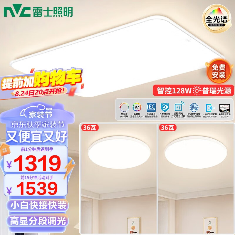 4、买了一个套装雷士(NVC)LED吸顶灯简约客厅舒适光小白系列灯具全屋智控高显灯饰白雪A,安装了以后感觉还可以,灯光柔和能调节