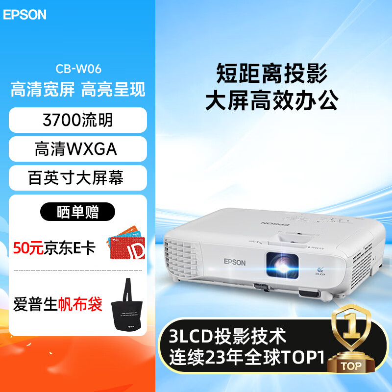 爱普生(EPSON) CB-W06 投影仪 投影机办公 培训(高清WXGA 3700流明 短距投影 支持侧投)价格:4299.00元!