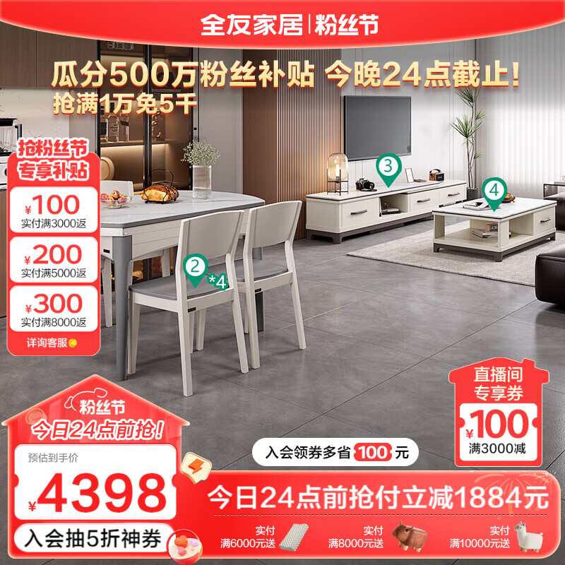 全友家居 现代简约客餐厅家用岩板茶几电视柜一桌四椅组合全套120709价格:6282.86元!
