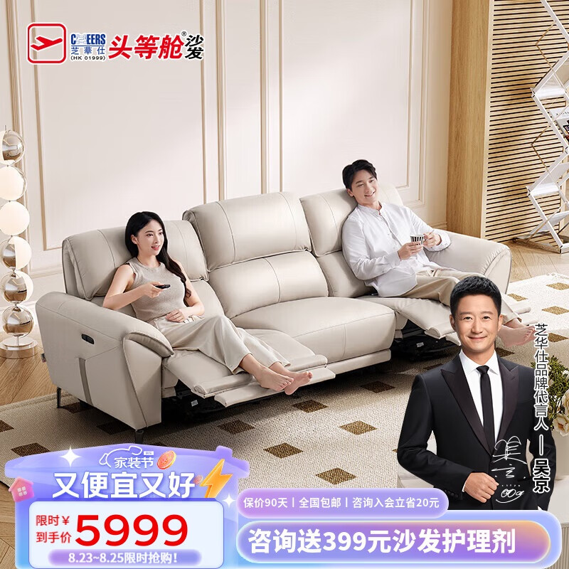 芝华仕(CHEERS)头等舱零靠墙真皮沙发现代功能客厅直排家具芝华士50953白三价格:5999.00元!