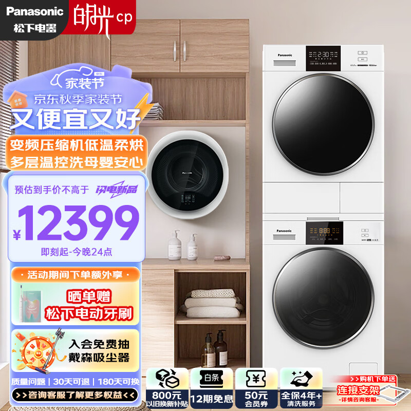 松下(Panasonic)【白月光3.0+小旋风】CP洗烘套装 10kg滚筒洗衣机+热泵烘干机+壁挂洗衣机 3E1AK+F1AR2+A500W价格:12399.00元!