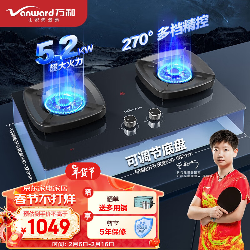 万和(Vanward)燃气灶双灶家用 天然气双灶具5.2kW大火力 70%热效率 分体易清洁 270°多档精控 燃气灶具 G8L90价格:1049.00元!