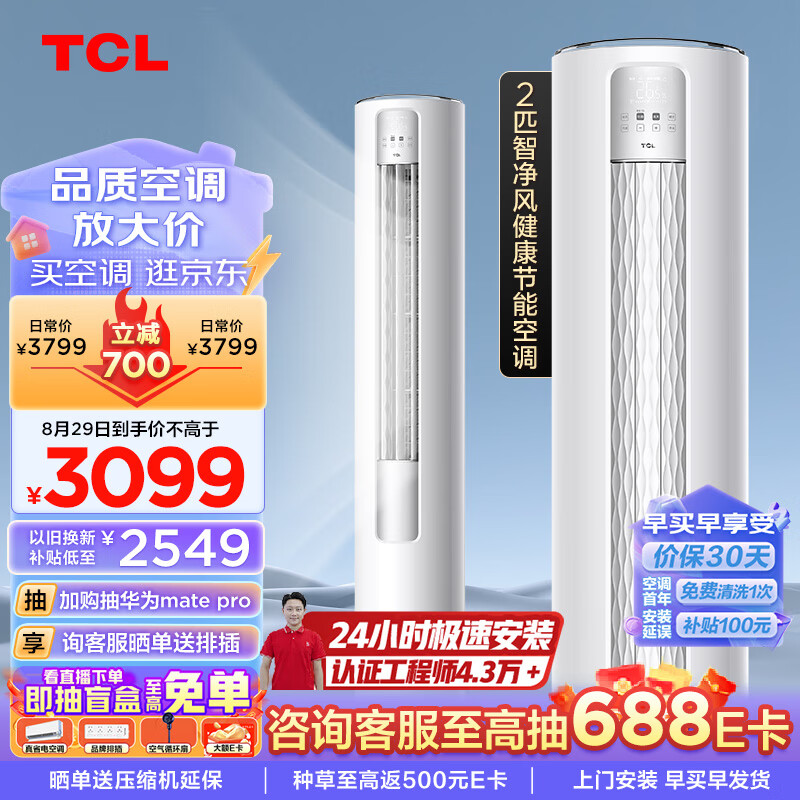 TCL空调 2匹 新三级能效 变频冷暖 智净风除菌 客厅空调立式 空调柜机KFR-51LW/JV2Ea+B3 以旧换新 价格:3099.00元!