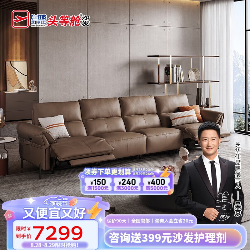 芝华仕(CHEERS)头等舱零靠墙意式轻奢真皮功能沙发大户型客厅芝华士50795棕四价格:7299.00元!