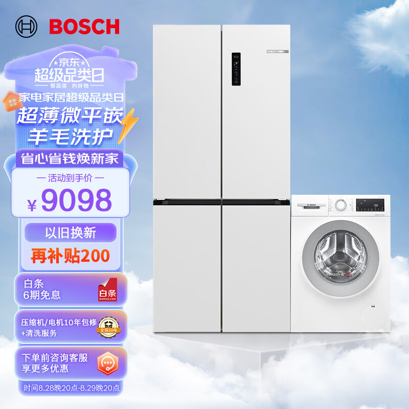 博世(BOSCH)冰洗套装【冰立方】497L十字对开门超薄平嵌+10KG滚筒洗烘一体机云朵白208C+152000附件仅展示价格:9098.00元!