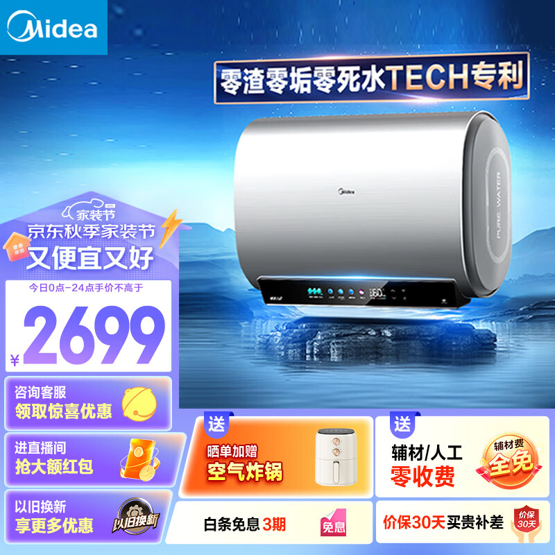 美的(Midea)TECH活水玲珑超薄60升 双胆扁桶电热水器防腐阻垢3300W镁棒免换净肤浴VIP保温F6033-UW5以旧换新价格:2899.00元!