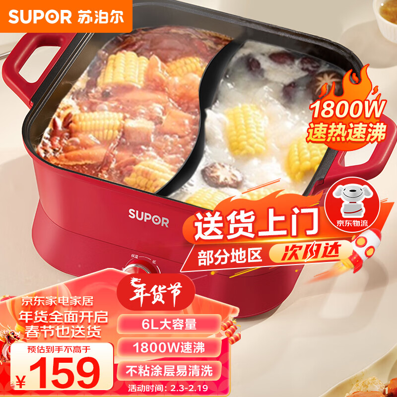 苏泊尔(SUPOR)鸳鸯电火锅 电煮锅 火锅专用锅 家用火锅锅电锅一体多功能锅 电热锅打火锅6L多用途锅H3030FK870Y价格:159.00元!