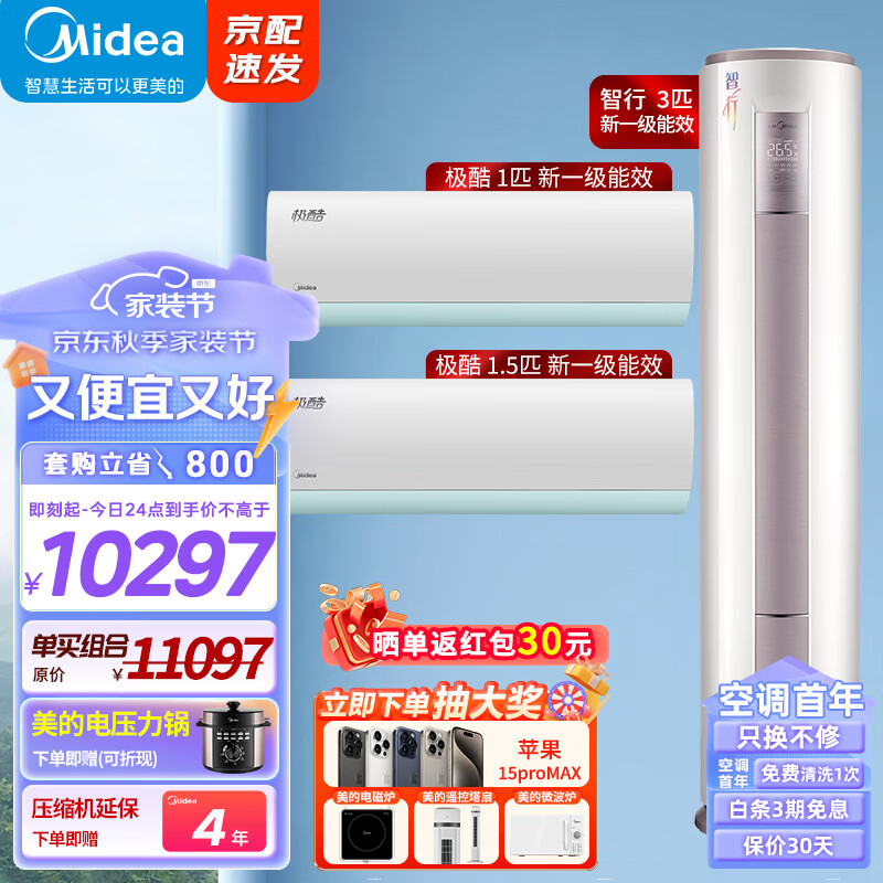 美的(Midea)空调套装 新一级能效 两室一厅 双节能低噪 升级自清洁 挂机(1匹+1.5匹极酷)+柜机3匹智行价格:10297.00元!