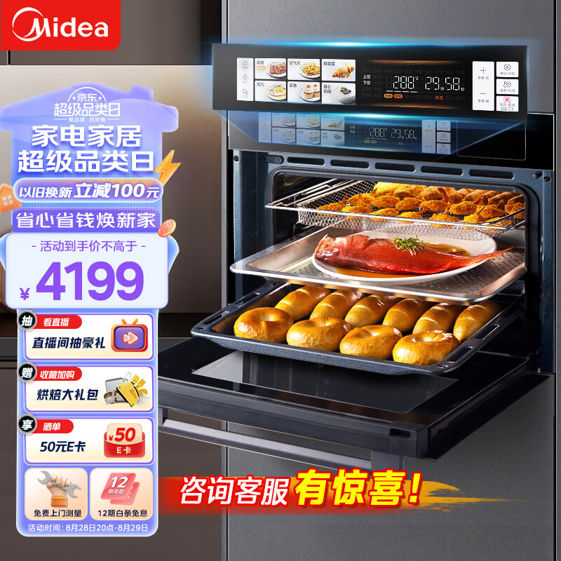 美的无边系列55L嵌入式蒸烤箱一体机 温湿智控 涡轮热风 蒸箱烤箱 蒸烤炸炖4合1体机SX5价格:4199.00元!