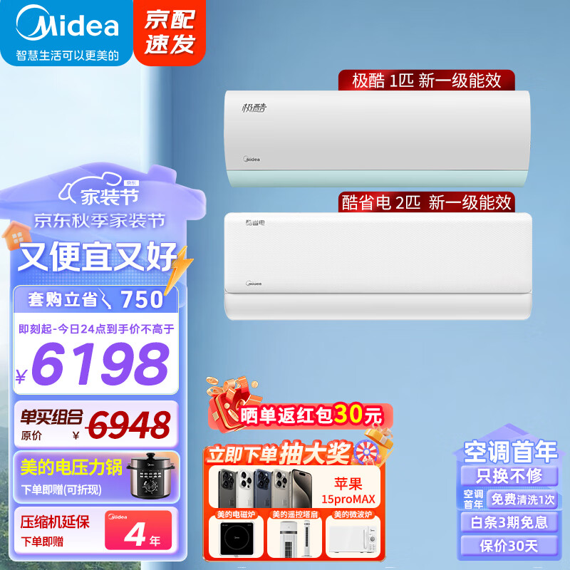 美的(Midea)空调套装 新一级能效 一室一厅 全直流变频冷暖 节能省电 智能自洁 挂机1匹极酷+2匹酷省电价格:6198.00元!
