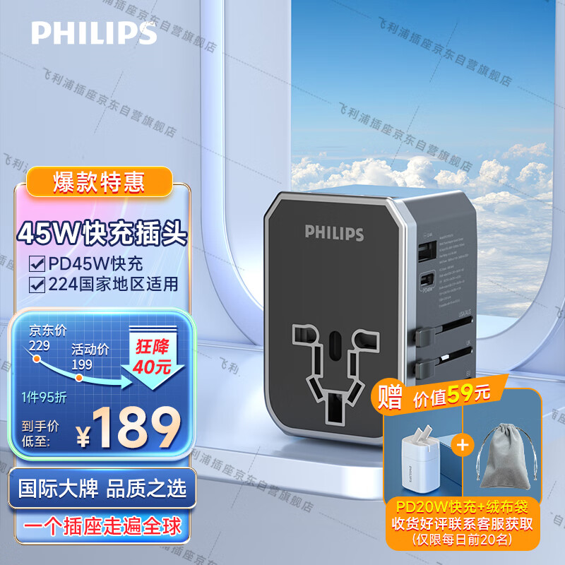 飞利浦(PHILIPS)通用出国旅行转换器/国际转换插头插座//英标欧标美标澳标日本适用45wPD快充1003A价格:199.00元!