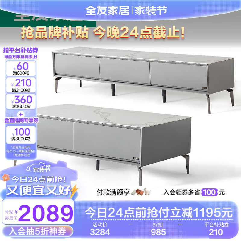 全友家居 现代简约岩板茶几电视柜组合客厅电视柜落地储物家具DW1055价格:3284.29元!