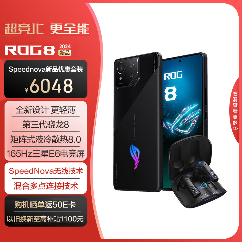 ROG8 AI游戏手机 12+256 曜石黑 骁龙8Gen3矩阵式液冷散热8.0 165Hz高刷【speednova耳机优惠组套版】价格:6048.00元!
