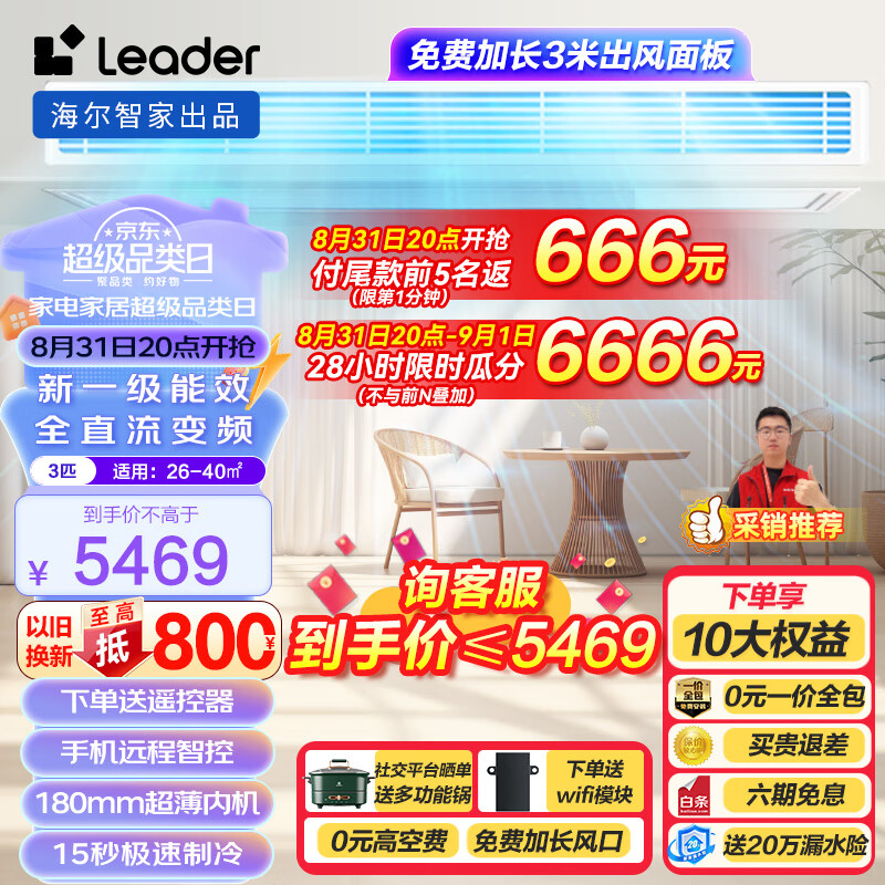 Leader海尔智家出品3匹P元气风管机一拖一级能效中央空调嵌入式全直流变频客厅空调 KFRd-72NW/73ED81TU1价格:5699.00元!