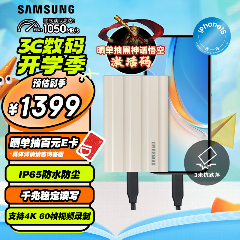 三星(SAMSUNG)2TB Type-c接口 移动固态硬盘 T7 Shield 月慕白 NVMe读速1050MB/s 手机直连笔记本外接 三防保护价格:1619.00元!