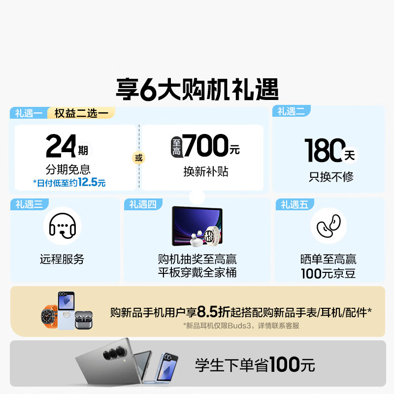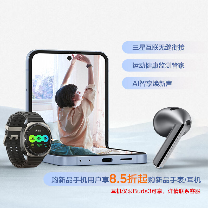 三星(SAMSUNG)Galaxy Z Flip6 AI手机 大视野智能外屏 5000万像素 骁龙8 Gen3 双卡 折叠屏 12GB+512GB 夏沫蓝价格:8999.00元!