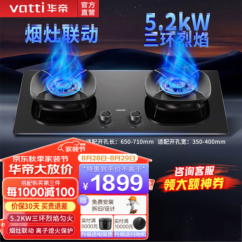 华帝(VATTI)家用燃气灶官方i10309台嵌两用5.2kw三环火力聚能盘68%超高热效率双灶具可拆卸炉头可调节开孔尺寸 【烟灶联动升级款】i10309L 天然气5.2kW价格:2199.00元!