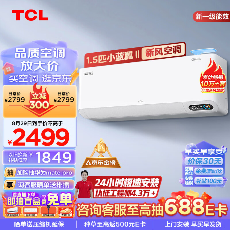 TCL新风空调1.5匹新一级 变频冷暖60m3/h大新风量小蓝翼Ⅱ卧室挂机 KFRd-35GW/D-SWA11Bp(B1)价格:2499.00元!