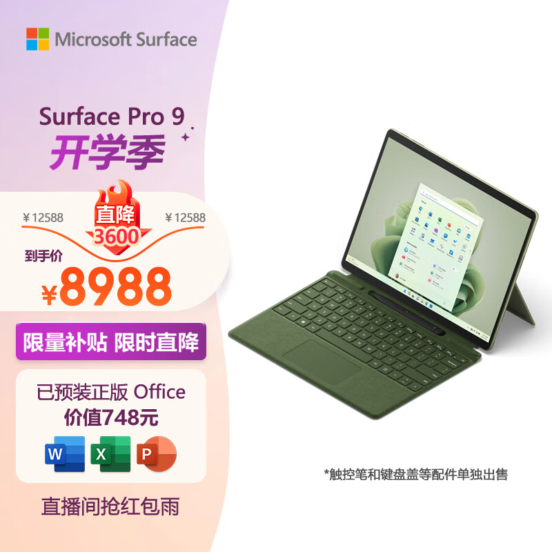 微软Surface Pro 9 二合一平板电脑 i7 16G+256G森野绿 13英寸120Hz触控屏 学生平板 轻薄笔记本价格:8988.00元!