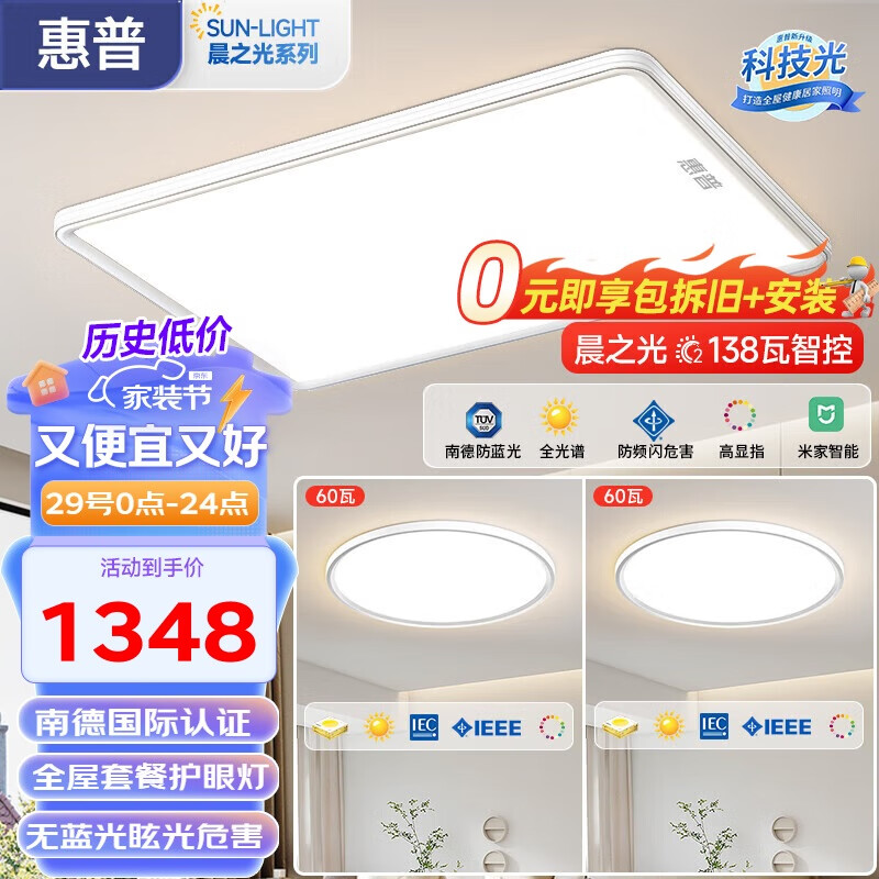 惠普全光谱护眼吸顶客厅卧室灯米家现代简约灯饰中山灯具全屋套餐K价格:2580.00元!