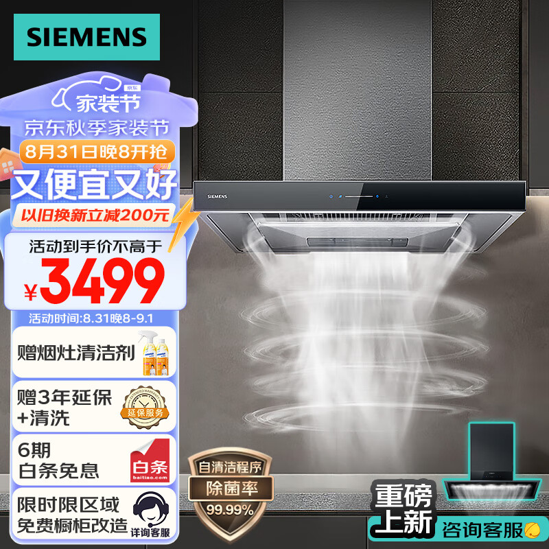 西门子(SIEMENS)欧式抽油烟机21.5m3/min顶吸家用吸抽烟机 5D立体环吸自清洁LC77UA951W以旧换新价格:3498.00元!
