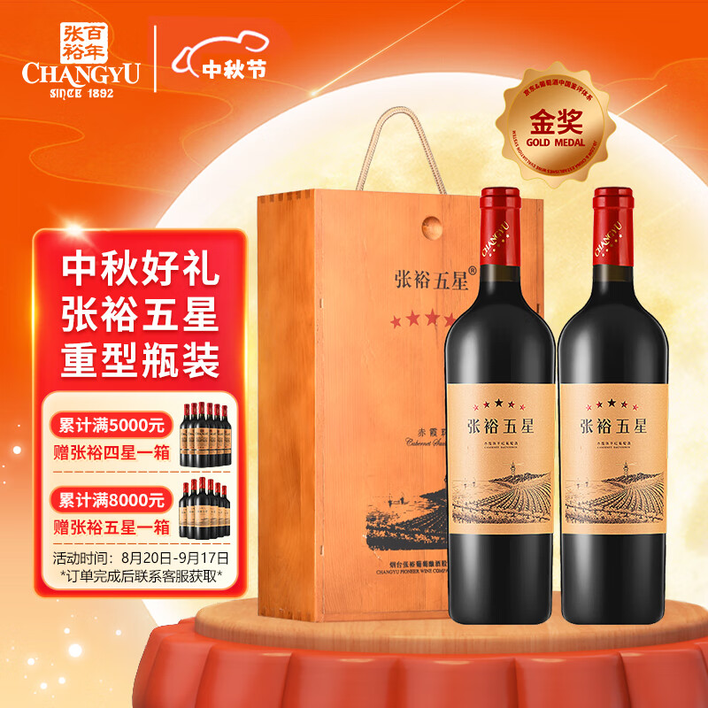 张裕(CHANGYU)五星赤霞珠干红葡萄酒 750ml*2瓶双支礼盒装 国产红酒 中秋送礼价格:596.00元!
