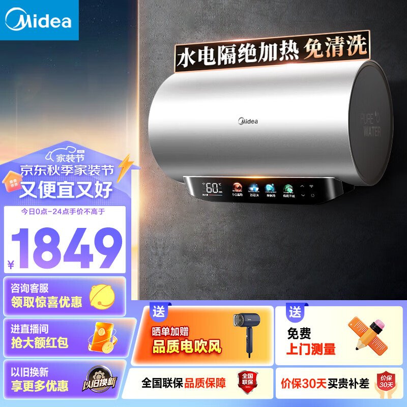 美的(Midea)水电分离60升电热水器家用 3300W变频10重过滤净肤瓷净舱除余氯内胆免清洗以旧换新F6033-PE9(HE)价格:2049.00元!
