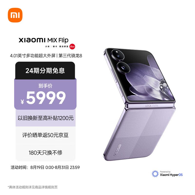 小米(MI)MIX Flip 小折叠屏 4.01英寸多功能超大外屏 第三代骁龙8 12GB+256GB 凤羽纤维版 5G拍照AI手机价格:5999.00元!
