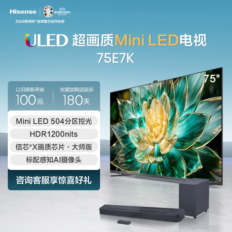海信电视75E7K+Bar500沉浸追剧套装 75英寸 ULED X Mini LED AI摄像头超感知 智能平板电视机价格:8998.00元!