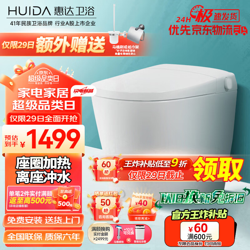 惠达智能马桶全自动一体坐便器恒温座圈加热带脚踢冲水E608 305坑距价格:3499.00元!