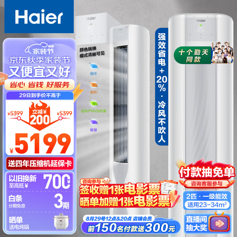 海尔(Haier)2匹 劲爽·荣耀 新一级能效 变频 快速冷暖 自清洁 家用客厅空调立式柜机 KFR-50LW/A1FAA81U1价格:5199.00元!