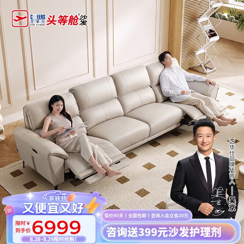 芝华仕(CHEERS)头等舱零靠墙真皮沙发现代功能客厅直排家具芝华士50953白四价格:6999.00元!
