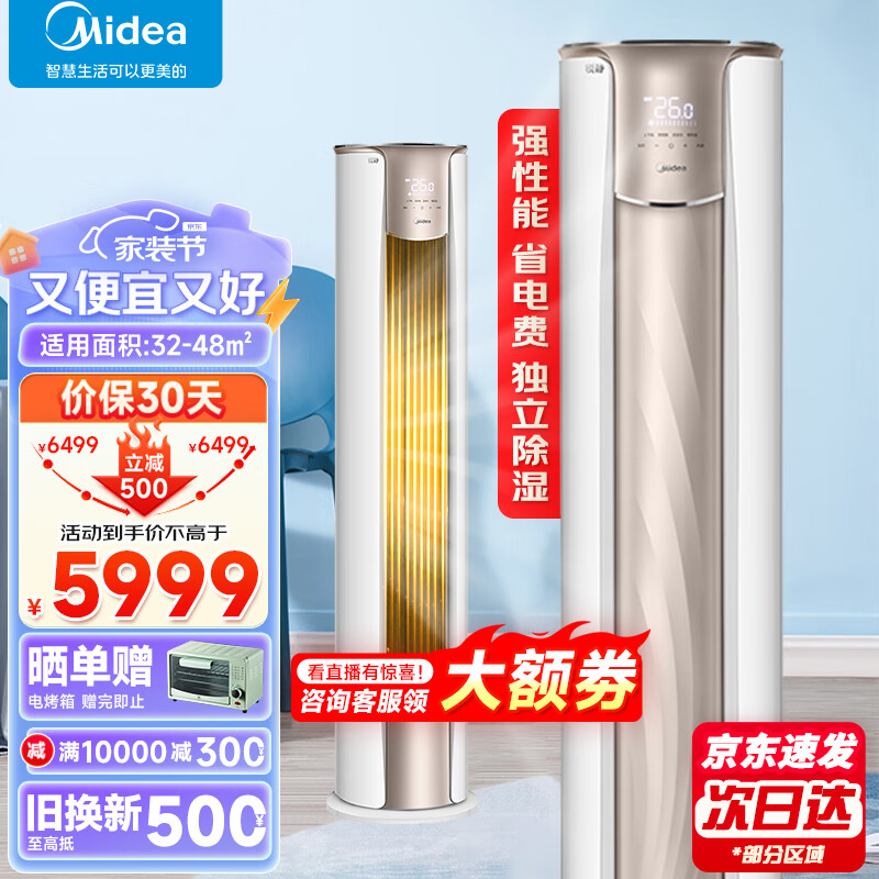 美的3匹 锐静二代 新一级能效变频冷暖 大风口自清洁智能家用客厅立式空调柜机 KFR-72LW/N8VHC1Ⅱ价格:5999.00元!