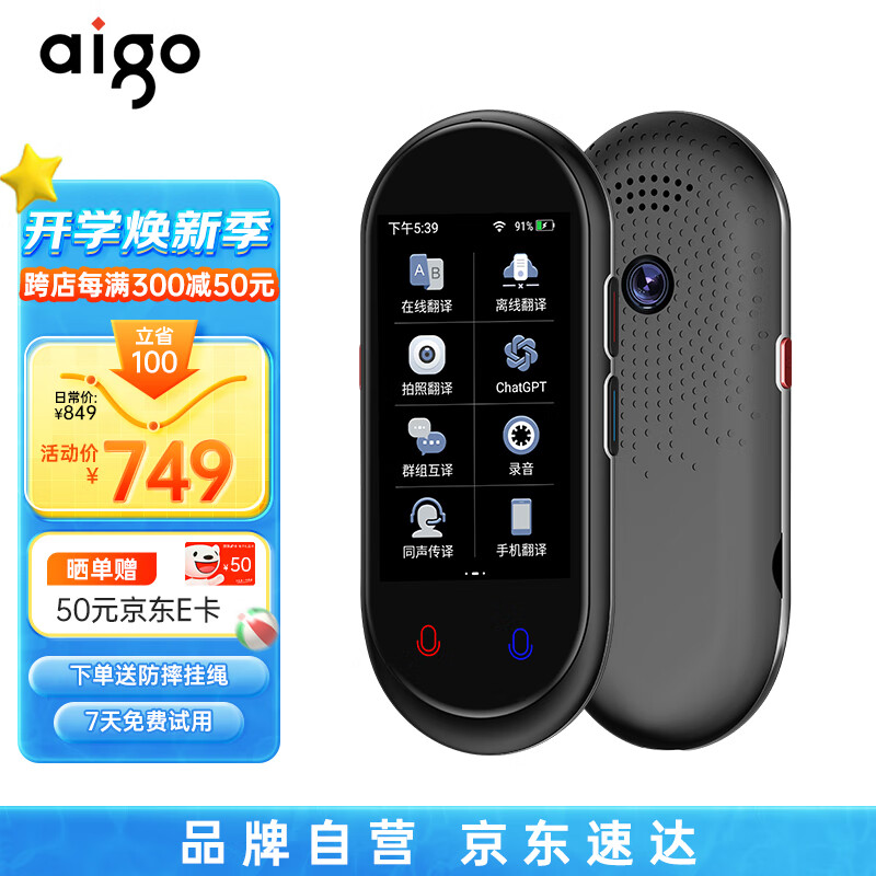 爱国者(aigo)同声翻译机 多语种离线同声传译拍照语音wifi连网智能翻译器迷你小巧翻译器出国价格:849.00元!
