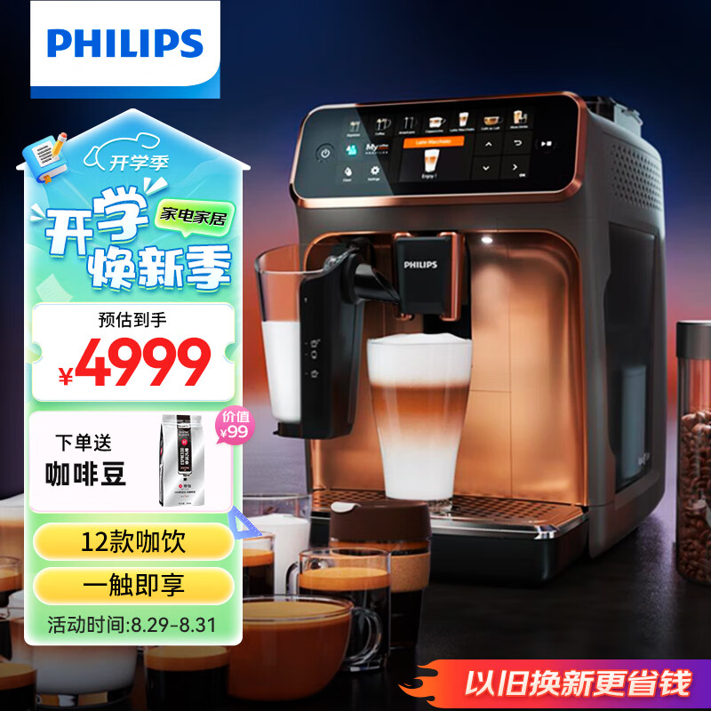 飞利浦(PHILIPS)【欧洲进口】云朵咖啡机5系EP5144/72意式全自动浓缩家用/办公奶泡咖啡机LatteGo牛奶研磨一体系统价格:4999.00元!