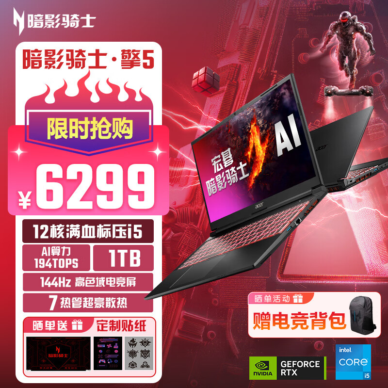 宏碁(acer)暗影骑士·擎5 15.6英寸游戏本 144Hz电竞屏 笔记本电脑AI大算力(12核满血标压i5 16G 1TB RTX4050)价格:6299.00元!