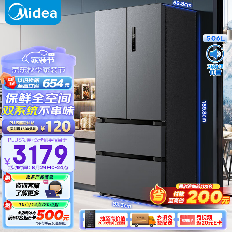 美的(Midea)532法式多门四开门电冰箱变频一级能效家用无霜双系统双循环大容量智能MR-532WFPZE价格:3899.00元!