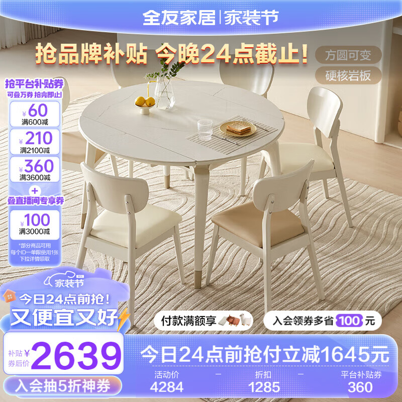 全友家居 现代简约可伸缩多功能岩板方圆餐桌椅子组合家用饭桌DW1121价格:4284.29元!