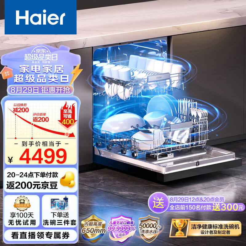 海尔(Haier) 大16套嵌入式升级款洗碗机大魔王W30Pro变频一级水效 双80℃消杀 分区洗 7天存储EYBW164286GGU1价格:4899.00元!