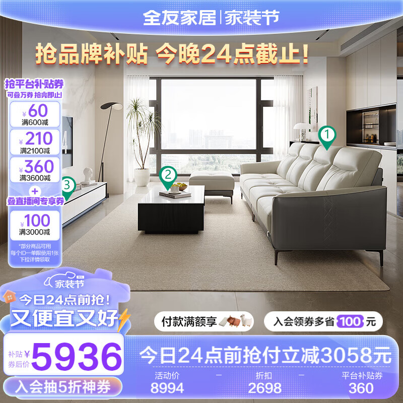 全友家居 简约客厅三件套装组合皮沙发岩板茶几电视柜主柜家具102710价格:8994.29元!